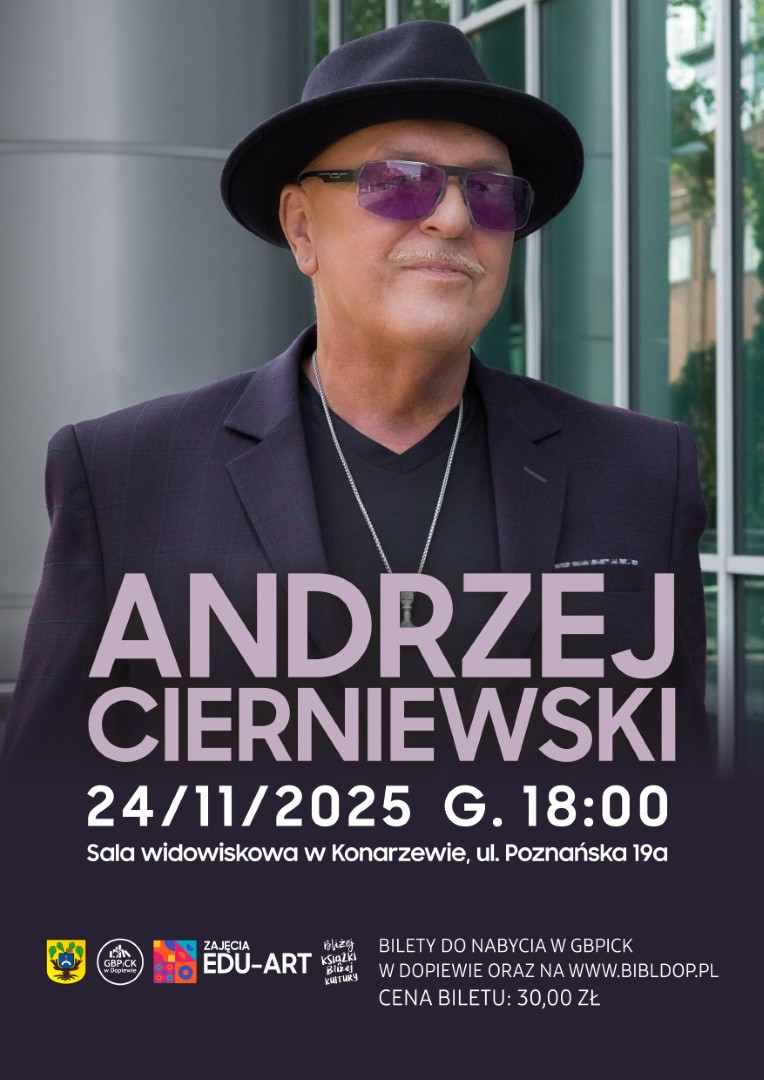 Już 24 listopada 2025 roku o godz. 18:00 serdecznie zapraszamy na wyjątkowy koncert Andrzeja Cierniewskiego w Sali Widowiskowej w Konarzewie, ul. Poznańska 19a.