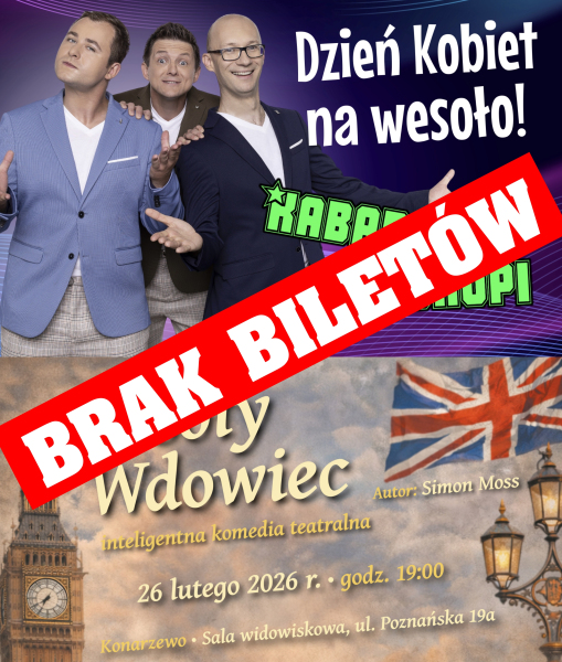 Informujemy, że na wydarzenia w dniu 5.03. (Kabaret z Konopi) oraz w dniu 26.02. (Spektakl Wesoły Wdowiec) nie mamy już biletów.