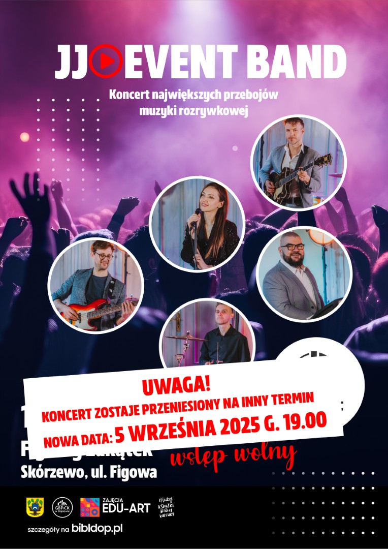 , jesteśmy zmuszeni zmienić termin koncertu zespołu JJ Band, który miał się odbyć 1.08.2025 na Figowym Zakątku.