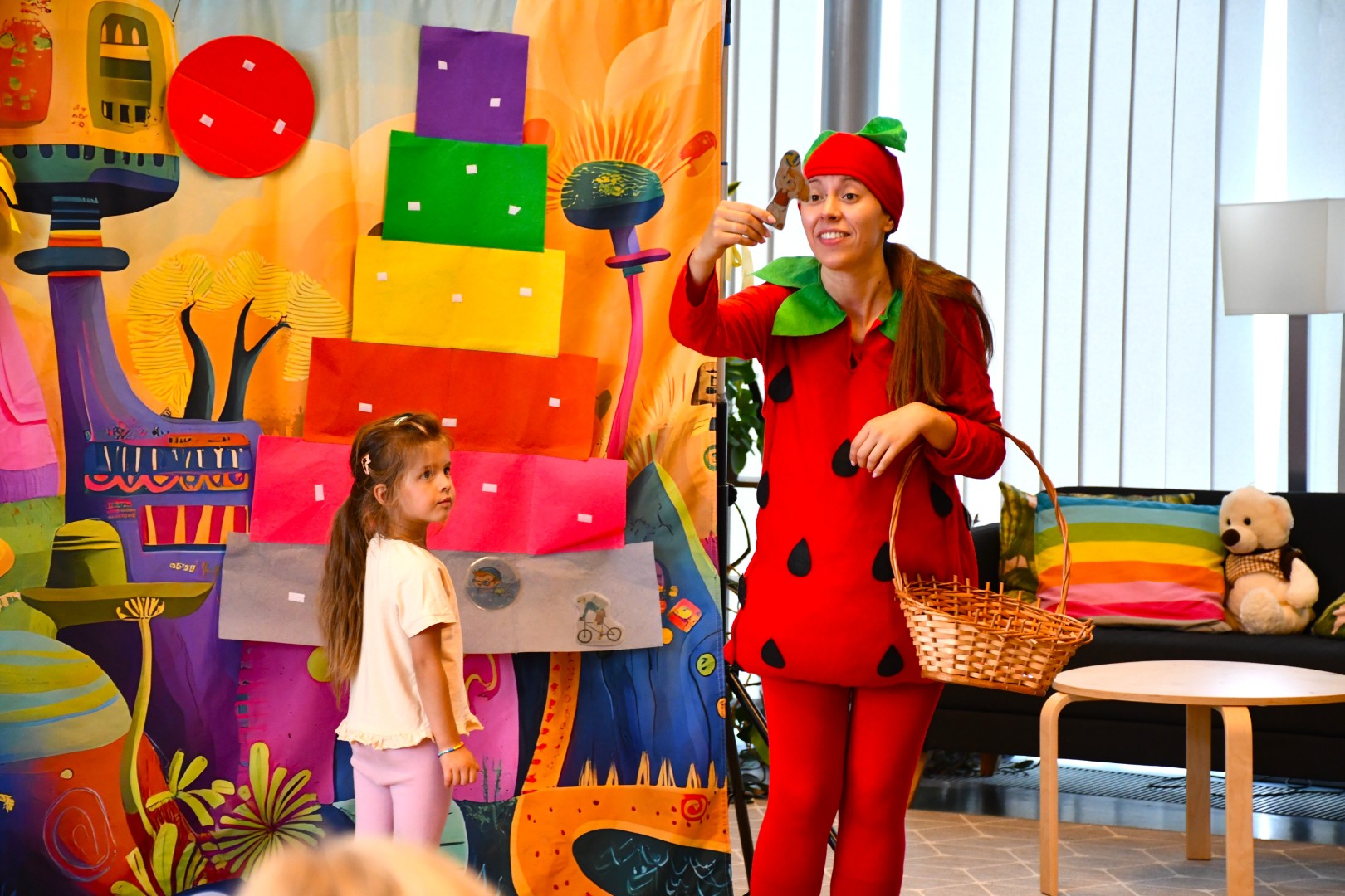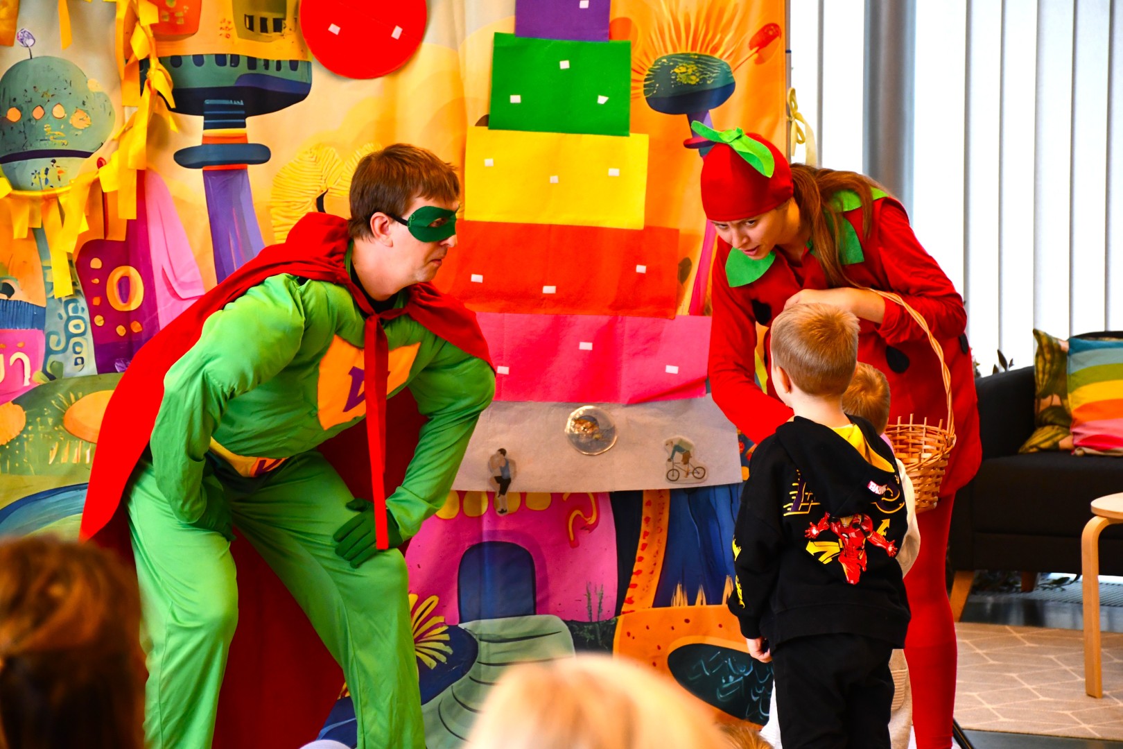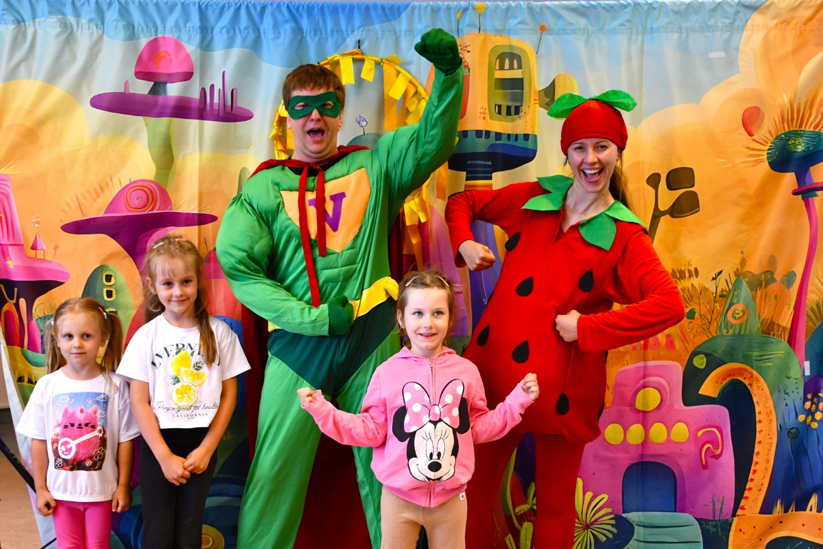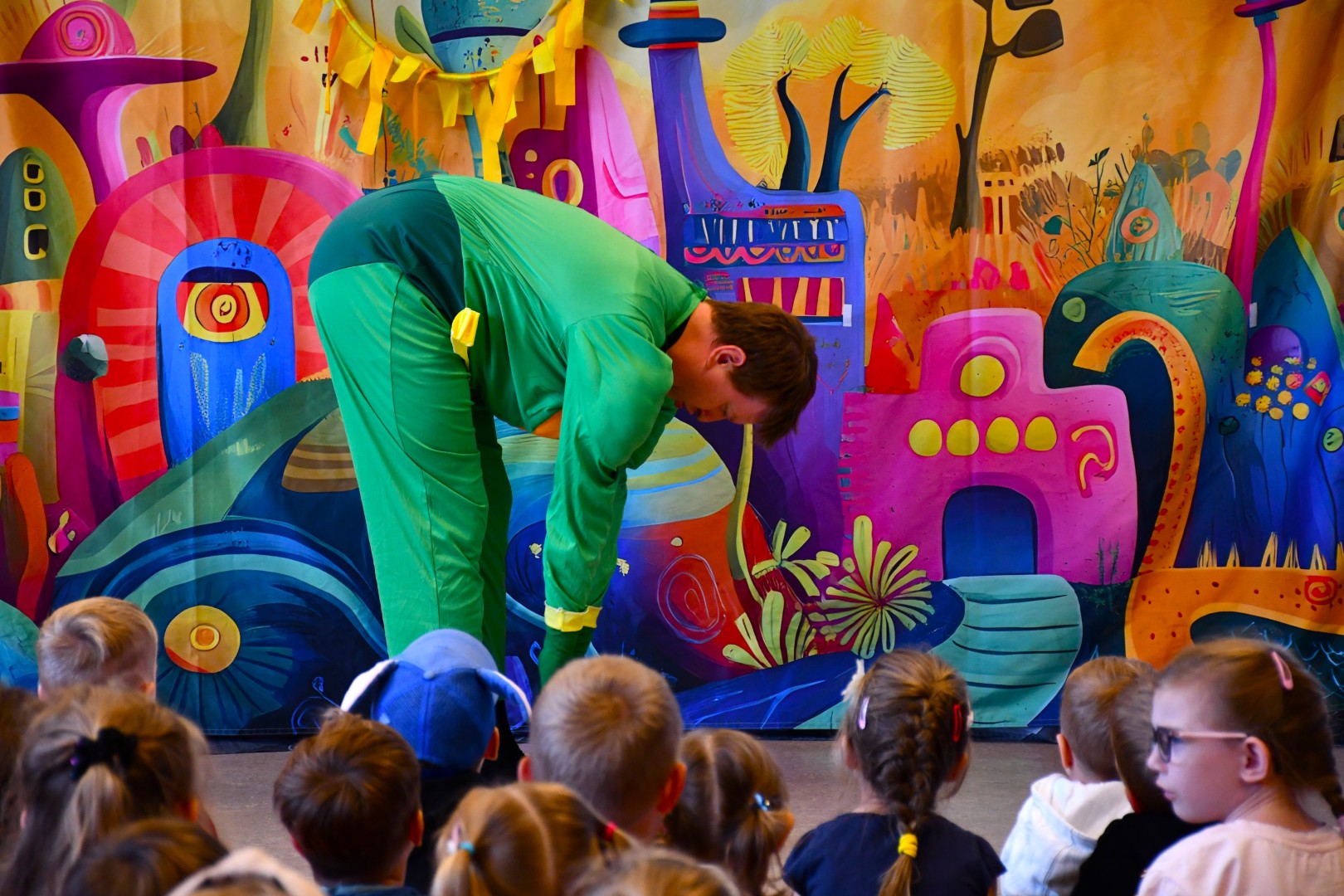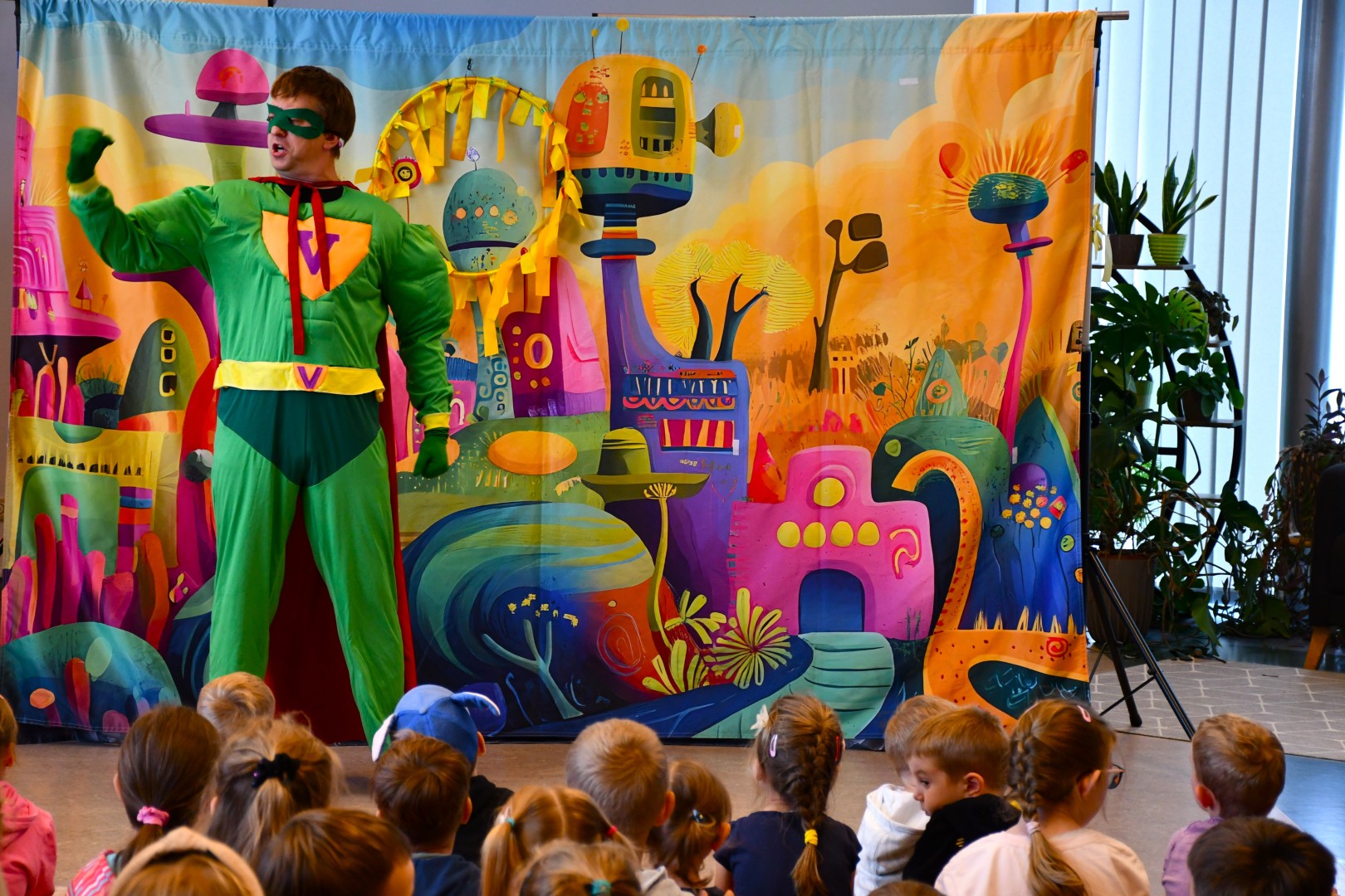 Spektakl był nie tylko świetną zabawą, ale również interaktywną lekcją o zdrowym odżywianiu. Dzieci nie były jedynie widzami – miały okazję aktywnie wspierać głównego bohatera, kibicując mu, a nawet odpowiadając na jego wezwania z publiczności. Mnóstwo śmiechu, kolorowe kostiumy, dynamiczna akcja i muzyka sprawiły, że zarówno najmłodsi, jak i dorośli bawili się doskonale.