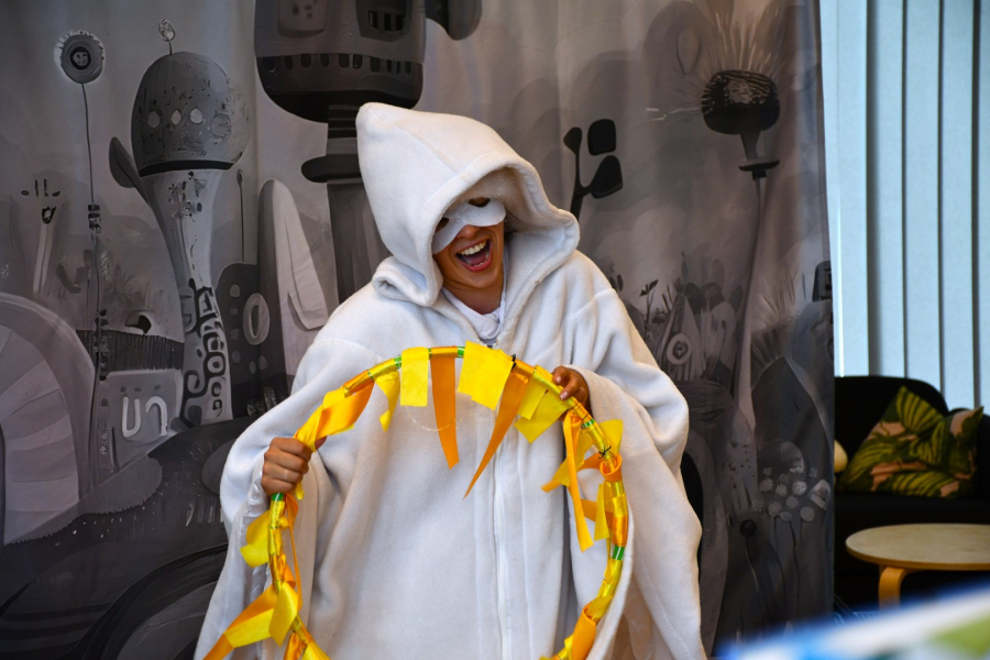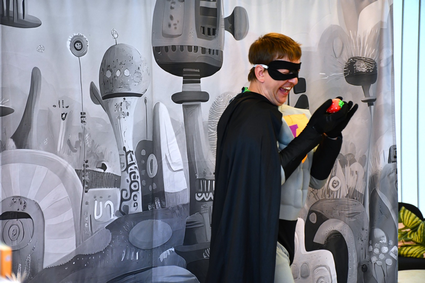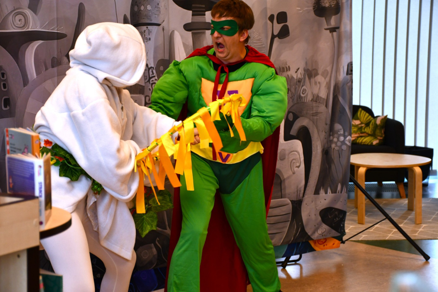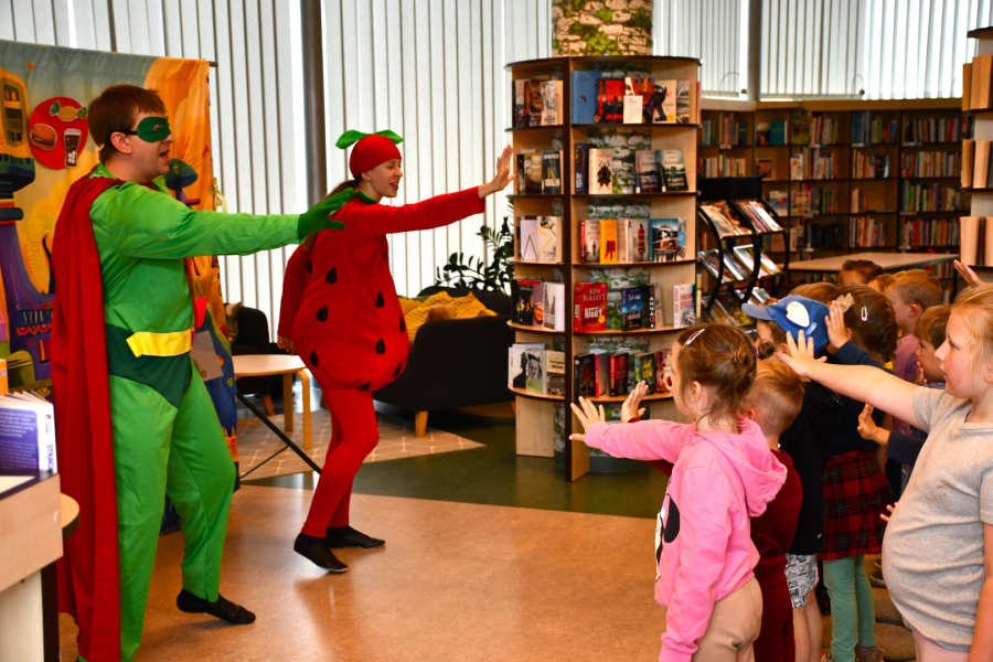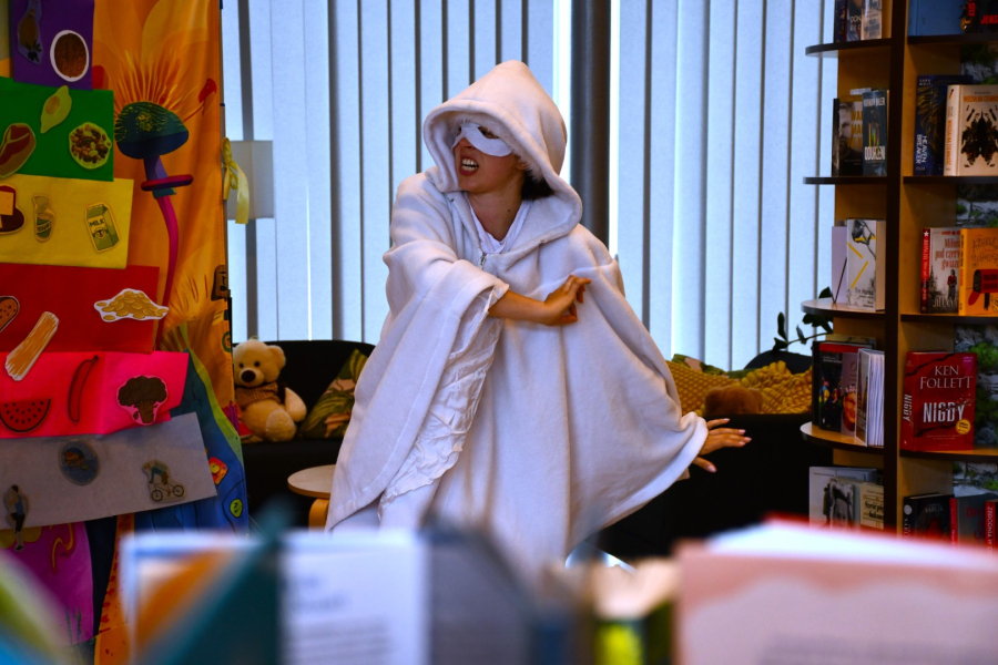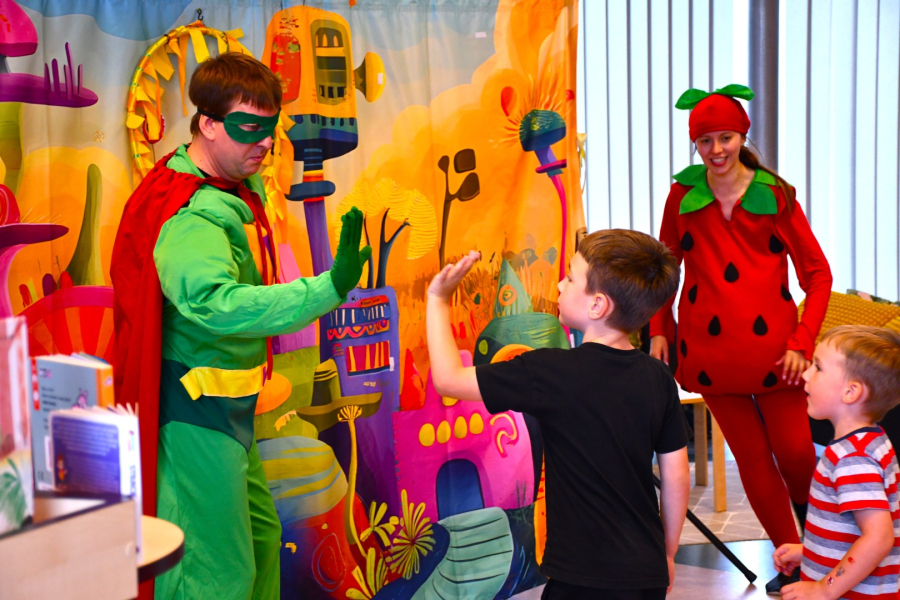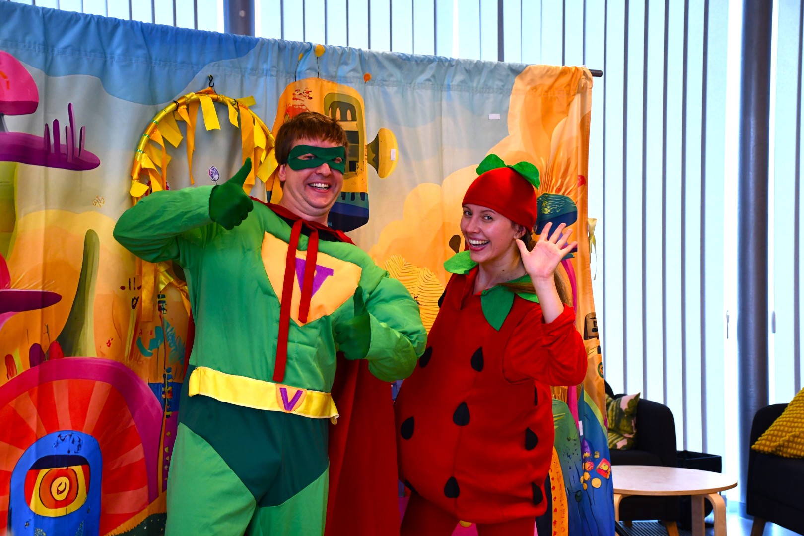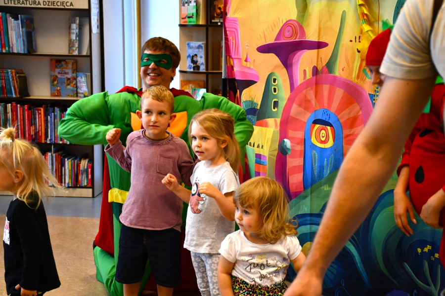 Spektakl był nie tylko świetną zabawą, ale również interaktywną lekcją o zdrowym odżywianiu. Dzieci nie były jedynie widzami – miały okazję aktywnie wspierać głównego bohatera, kibicując mu, a nawet odpowiadając na jego wezwania z publiczności. Mnóstwo śmiechu, kolorowe kostiumy, dynamiczna akcja i muzyka sprawiły, że zarówno najmłodsi, jak i dorośli bawili się doskonale.